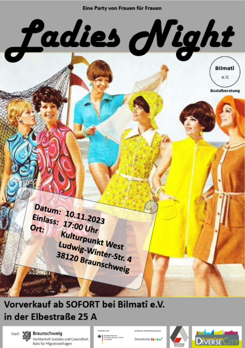 Hiam organisierte für den 10. November 2023 mit ihrem Team von Bilmatî e.V eine Ladies Night von Frauen für Frauen. Viele der Frauen, mit der sie im Rahmen ihres Vereins zusammenarbeitete, wünschten sich eine Party nur für Frauen. Über bestimmt fünf Ecken gelangte diese Einladung dann auch in meine Hände. Über E-Mail nahm ich Kontakt zu Hiam auf und sie lud die Bundesfrauenvertreterin der DJG und mich exklusiv zu ihrer geplanten Ladies Night ein. Ich war wirklich sehr gespannt und freute mich, sie dort zu treffen.