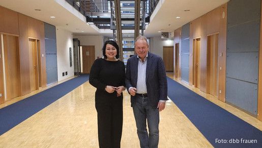 Im Austausch mit Frank Bsirske MdB (Grüne), ordentliches Mitglied im Ausschuss für Arbeit und Soziales, übergab dbb frauen Chefin Milanie Kreutz die Forderungen der dbb